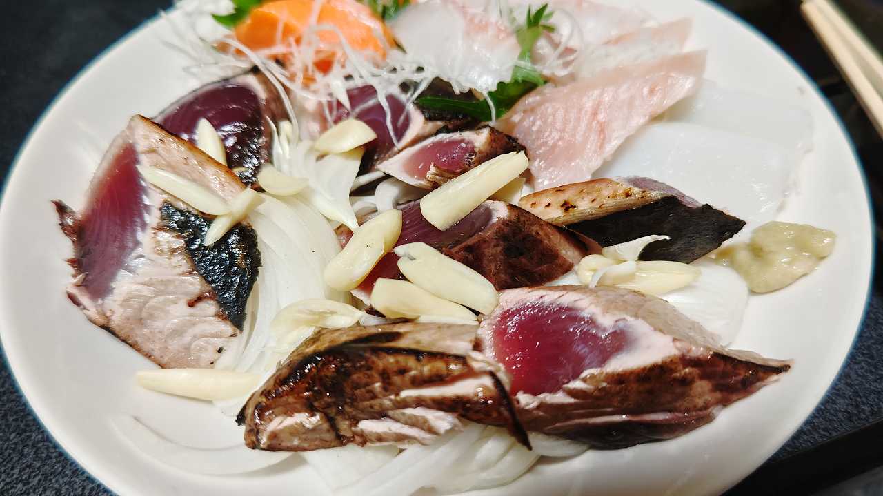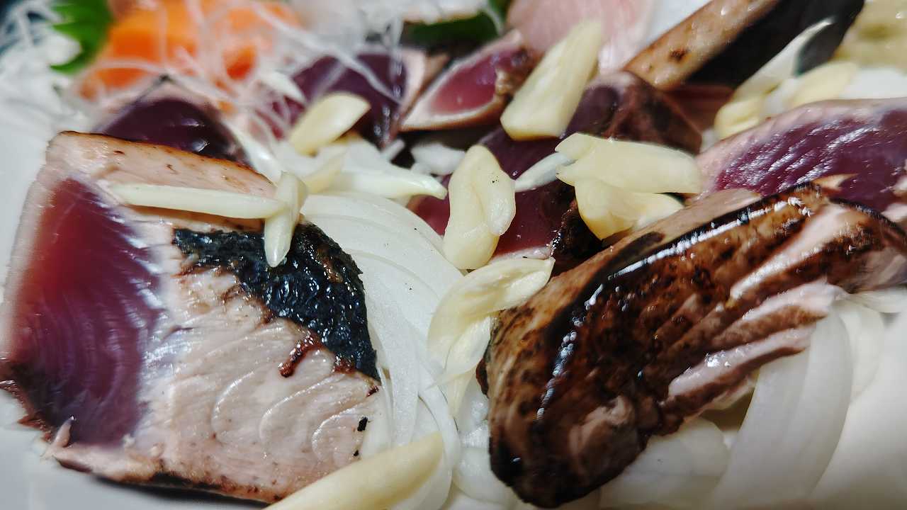 刺身セットと、カツオのタタキが一本売りしてたので、超分厚く切って