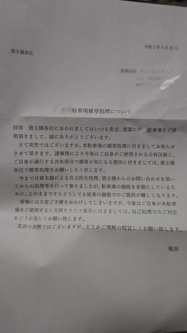 駐車場の値上げ??かと思ったら、草抜きは自分でってことでした。