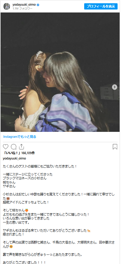 与田は「たくさんのゲストの皆様にもご協力いただきました!一緒にステージに立ってくださったブラックマヨネーズの小杉さん、桃ちゃん、ヤギさん」とそれぞれのオフショットを投稿。ブラックマヨネーズ・小杉竜一(51)のリハ映像も公開し「小杉さんはお忙しい中歌も踊りも覚えてくださりました!一緒に踊れて幸せでした🐻超絶アイドルこすっちょでした!」と紹介。また、サプライズ登場した同期で元メンバーの大園桃子さん(25)とのハグショットとともに「そして桃ちゃん。よだももの逃げ水をまた一緒にできてほんとうに嬉しかった!いろんな思い出が蘇ってきました。一生の思い出です」と思いを明かした。