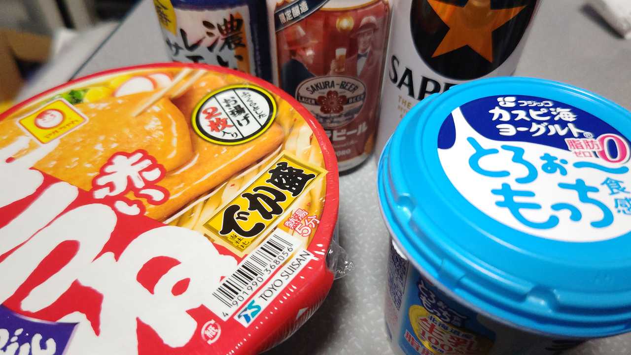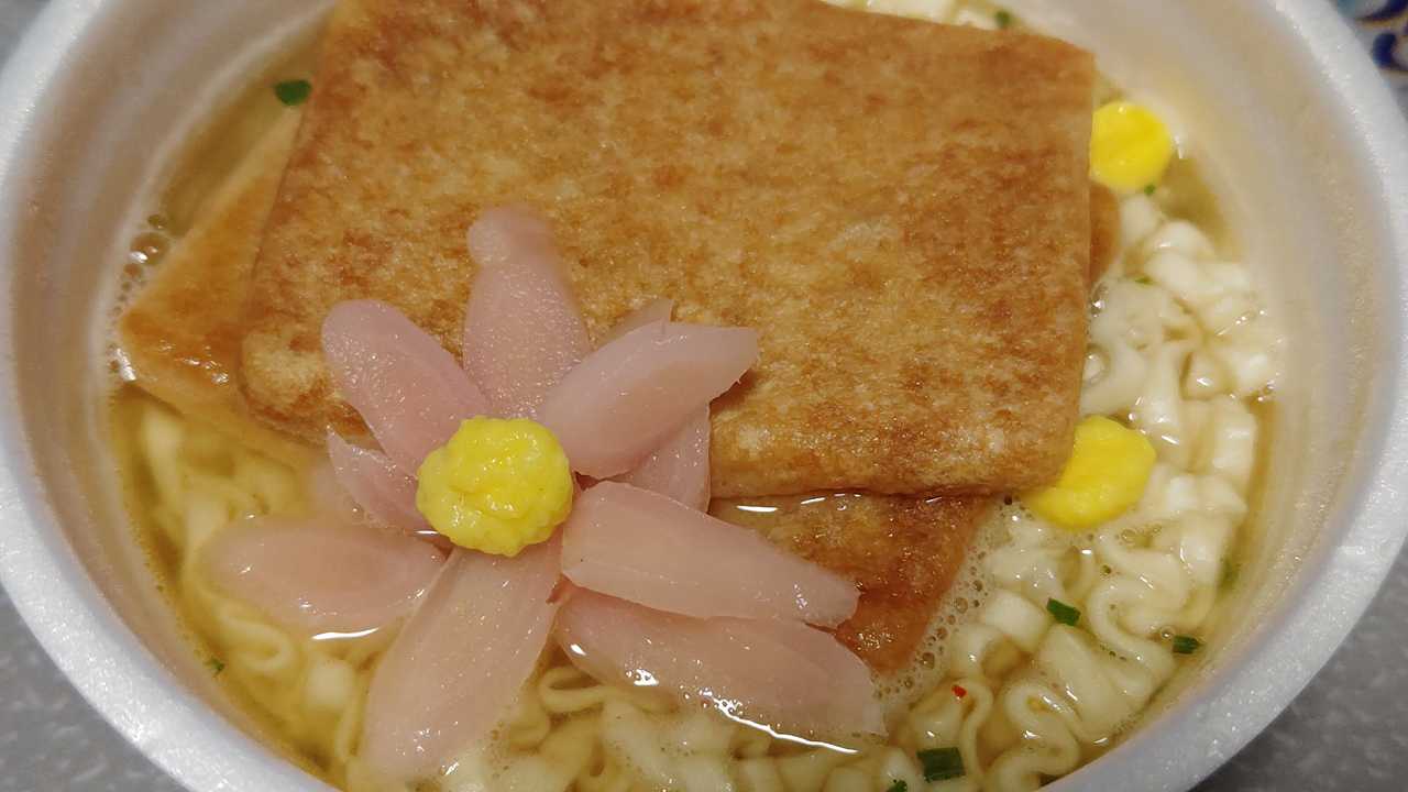 朝飯、赤いきつね でか盛りに、岩下の新生姜 花盛でいただきます。