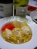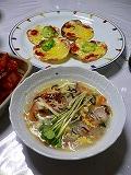 今夜は酸辣湯と餃子でした。奥にあるのは餃子皮のピザ風です。