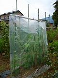 キュウリの後にだめもとで種を蒔いたインゲン。このままじゃ寒くなって育ちそうにないので防寒仕様にした。成長の良いものはビニールシートの外に伸びている。果たして収穫なるだろうか? 採れたらうれしいなぁ。