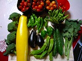 今日の収穫ズッキーニ1本、ブロッコリ4個、スティック・セニョール2本、キュウリ3本、長ナス2個、万願寺唐辛子9本、オクラ6本、カボチャ3個、ミニトマト、白インゲン、ラズベリー。