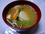 自家製野菜の味噌汁。間引きした聖護院大根、白インゲン、カボチャ入り。