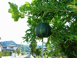 畑の隅の塀際に植えたカボチャの蔓が隣の木をつたって上に伸びていた。ふと塀の上をみると、空中にぶら下がるカボチャを発見した。