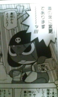 今日は、自己マン日記で失礼します。タイトルで、お気づきの方もいらっしゃると思いますが、ケロロ大好きです。この前、最新刊の16巻を買ったところです。その16巻を読み返し、その後、友人宅から帰ってきた9巻~を読み返したところ、何度読んでも自分がかわいいと思った絵のところで、止まるので、今日は、そんなページの絵を見せようと思います。かなりくだらないですがwwケロロ小隊は、5匹。おなじみケロロ軍曹、ギロロ伍長、タママ二等兵、クルル曹長、ドロロ兵長(ゼロロ) ↑ ↑ ↑ ↑ ↑ みどりの奴 赤い奴 黒い奴 黄色い奴 青い奴この中で一番すきなのは、ギロロヽ( ゚ 3゚)ノギロロは、なつみがすきなんです。ちなみに上の写真は、はじめのほうの顔。やっぱり、1巻と、新刊では、絵が違いますよね~ちなみに、ケロロは、これ↓なんか、平べったい?!こんなケロロもいました。ちなみに、この↓は、干からびているケロロとタママそんで・・・これが↓ うちにある知恵の輪と同じ知恵の輪wwまーそれは、いいとして、だんだんと巻を重ねるうちにやっぱ絵が変わってきました。ケロロ浸ってます。しぶーーーい( ゚Д゚)この↓ギロロは、お気に入り(´▽`)やさしーーーのそんでもって、うちがギロロの次(にすきなのが、ケロロだから・・・)次にすきなのが、ガルル。ギロロのお兄ちゃんです。この兄弟は、とても仲がいい。お兄ちゃんは、本当に大人びた性格です。2匹とも目つきがわるいんだけども、性格がこのなかでは、一番優しいかな。だから好き。さて、ギロロがすきなんだけども、かわいい絵があまりなく、探しているうちに、ケロロのかわいい絵が多かったので、ケロロ出します。綺麗な敬礼でしょ?これが最後の言葉になるとは・・・(つづきは、10、11巻で)ケロロは、ほんとうにかわいい。憎めないです。本当に。なにやっても、かわいい奴なんです。このケロロの笑顔には、吹きましたww実にリアルwwこの後何が起こったかは・・・ウエットマンにきいてくださいwねっ(´▽`)こんなに顔がくずれているのに、かわいいでしょ?ちなみにケロロは、ガンプラがすきなんです。この写真関係ないけども。かえるなのに、カッパ着てます。これも、またおかし。5月は、まだ先ですね。ケロロが鯉に飲み込まれそうです( ゚Д゚)ここらで出しますかwwケロロとタママとクルル。今、思ったけども、このタママの顔が一番かわいい。うらみ~つらみ~あべっ!ドロロの写真撮るの忘れたwwドロロないちゃうなぁ~結構漫画でおおいのは、このスリーショット。↓ギロロ・ケロロ・タママケロロのくだらない計画に、いつもギロロは、乗ってあげてます。タママは、ケロロの子と好きだから乗っているんだと思います。ケロロが一番かわいかったのが、湿気を調節する機械をつけて、赤ちゃん状態になってるときのケロロ↓と、ぬいぐるみになったので、自力で動けないケロロ↓これがすごくかわいかった~~みんなにうちの思いを伝えたかったんだ~あとは、これもかわいい↓子供のころのケロロタママとケロロの違うところは、口元と尻尾。やっぱり、かえるの子は、おたまじゃくしなので、タママもケロロの子供のことの写真も、おたまじゃくしっぽいんですヽ( ゚ 3゚)ノちなみにギロロも( ゚Д゚)目つきは変わりませんねwwギロロは、うちと同じで、ネコが好きみたい。ネコにやさしくしているところも好きです。↓このネコもギロロがすきなんですね(´▽`)そーだ!大事なこと忘れてた。途中でうちにそっくりな奴が出てくるんですよww↓ほらww口元なんてとくにですよねwwARIAのアル君にもみえますがwwさて、ここまで読んでくださった方ありがとうございました。そしてお疲れ様でした。こんなくだらない自己マンですみません。ケロロ好きな方いらっしゃいましたらお話しましょう(´▽`)最後に、うちが一番気に入っているギロロの写真でお別れします。では~また'`,、( ゚ 3゚) '`,、