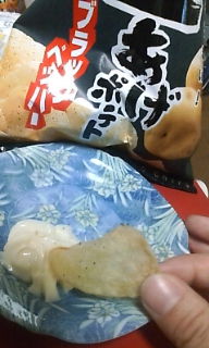 最近体を動かそうと努力してます。いろいろね。機械に頼ったり~ちゃんと意識したり~とかいいつつも?バイトが終わるとおなかがすいて我慢できない。バイト先と家のちょうど真ん中にコンビニがあるせいで、帰りには、何か買っちゃったりしてます。今日は、これ!そう!!!!!!みんな大好き堅あげポテト!これのブラックペッパー味?にマヨネーズをつけて食べるのが大好き。やったことない人は、ぜひ挑戦してみてください。本当にとまらなくなるよ!!そんでもって、挑戦した人正直な気持ちや、ほかのマイブームなお菓子を紹介してください。・・・・あっ!・・・・・・・・・・コレでもダイエット中ww