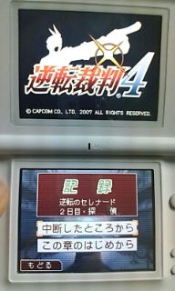 いまさらですが、逆転裁判です。1からちまちまやって、とうとう4にいきました。頭使いますねーーー遊んでないですよ?脳を動かしてるんです。そーゆーことにしておいてください。DSある方は、ぜひやってみてくださいねーー