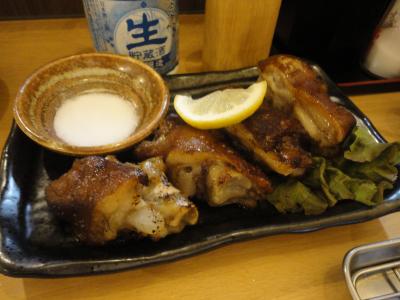 豚肉の梅紫蘇巻き、茄子、鯖の竜田揚げ串。かなり美味しい。リーズナブル。そうそう豚足もありました。