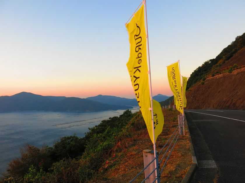 さてもネタ切れ。よし、それじゃーネタを拵えるか。某日、鯉の餌やり散歩前、空の地蔵に出かけました。快晴だったのです。急に思い立ち、日の出を撮影しよう。其所に到着は午前5時40分。太陽はまだでした。写真はツール・ド・九州の幟です。畑野浦からの坂道、ここがピークということでレースの山岳ポイントチェックになっています。