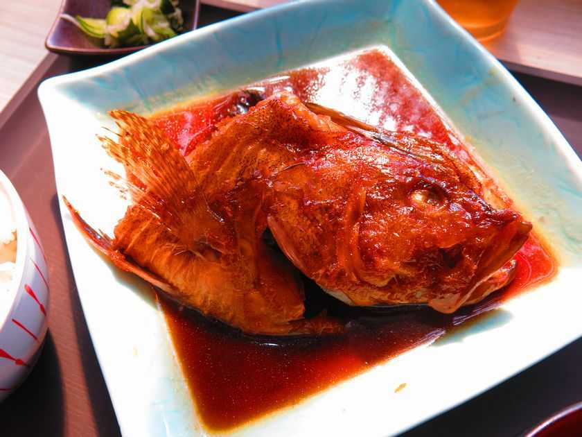 黄紋鰭(オウモンハタ)の煮付け。所用で山向こう、蒲江に行った折り、うさぎ亭という海岸沿い、見晴らしのよいレストランに立ち寄りました。これ、味噌汁とご飯付きの定食でした。昼ビー出来なかったのが残念。