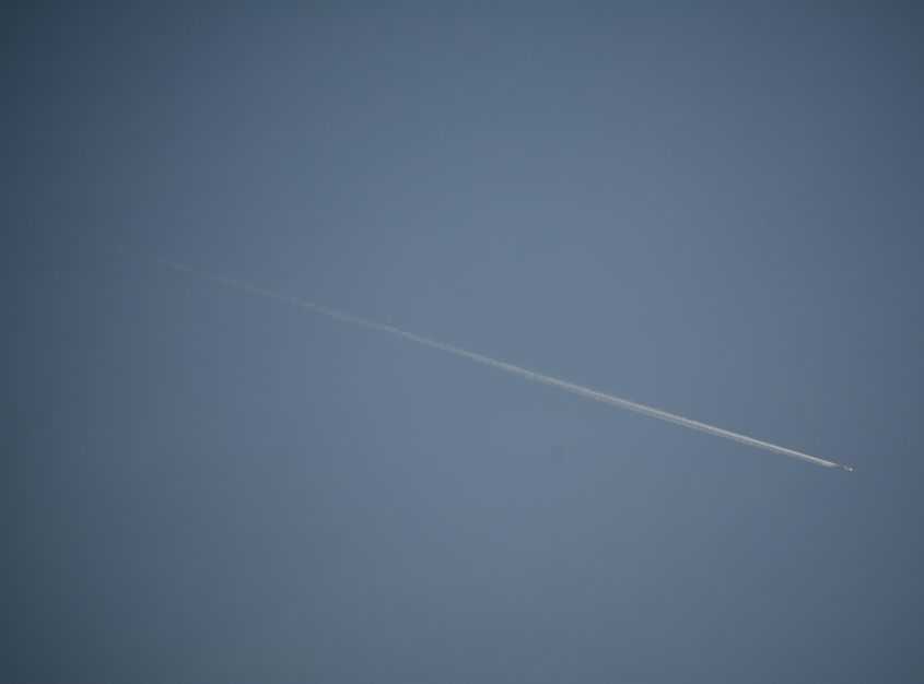 見上げるとコントレイル。フライトレーダーで調べたら香港発成田向けの便でした。