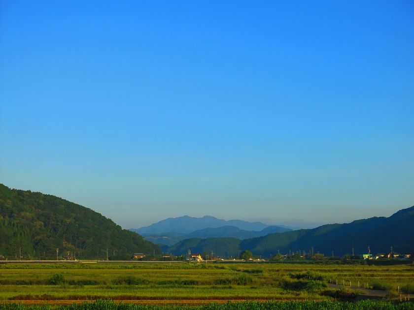 空気の澄んで、沖田越しに眺めた霊峰尺間嶽です。空が蒼い。