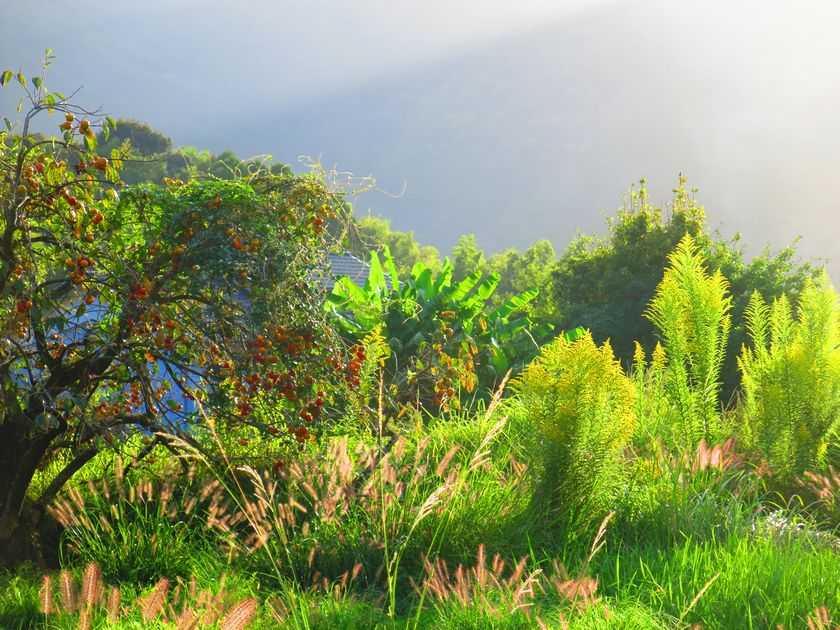 散歩も夕刻になると、色合いが深まります。次の写真は夕日に映える柿と黄色を帯びた雑草の類いです。隣は何をする人ぞ。