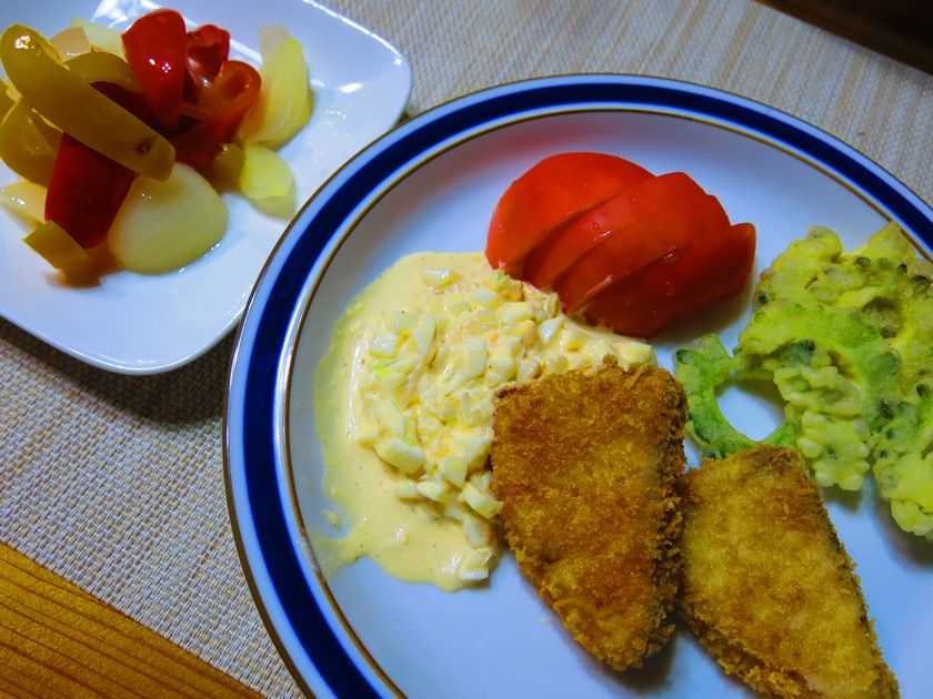 これは鰤カツ。先日、鰤の半身を柿と交換しました。刺身や漬けにしましたが、一部を取りおいてカツに。美味しかったです。白ワインに合わせました。