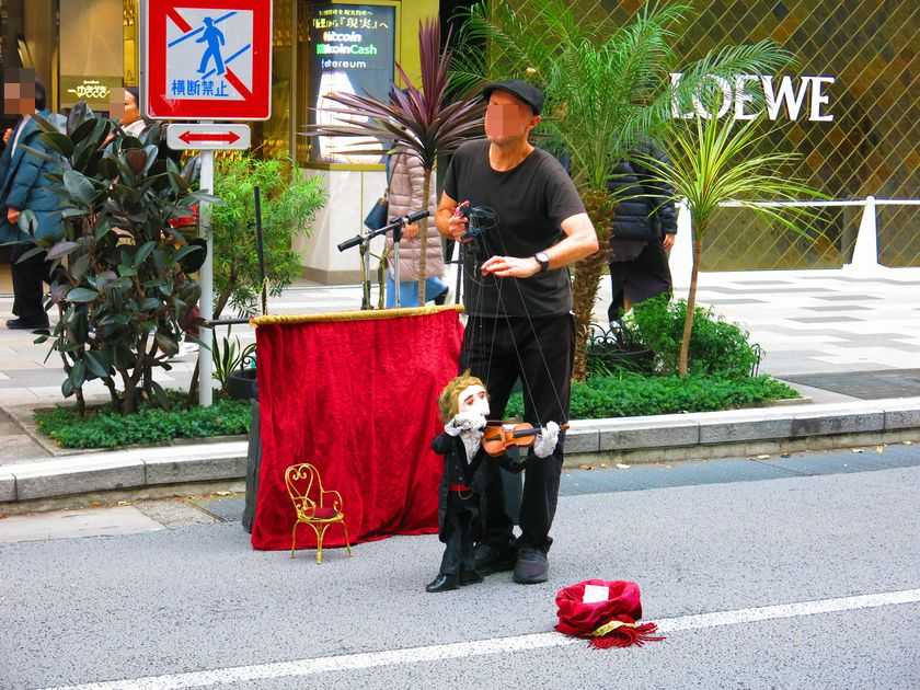 1枚目は銀座通りのホコ天に大道芸人。後ろの赤い布に隠したアンプスピーカーから流れる音楽に合わせ、バイオリンを弾く操り人形を操っていました。よく耳にする映画音楽でした。手前の赤い布バッグには投げ銭が。一極終わる度、硬貨に混じり北里先生が。東銀座まで同行してくれた義弟曰く「こりゃー儲かるぞ」