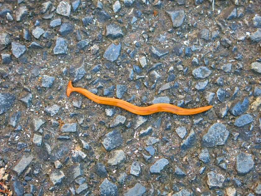 歩を進める道の真ん中を黒笄蛭(クロコウガイヒル)が這っていました。蛭とありますが、人の血を吸いはしません。写真のそれは5cmほどの長さでしたが、調べて1mほどの長さに伸びるとのこと。それにしても笄(コウガイ)ではあります。コウガイとは髪を掻き上げたり留めたりする際に使う用具。簪の類です。