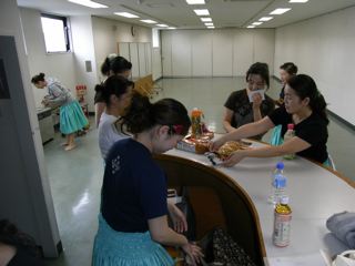 Kapuahaulaniです。今日の札幌は昼から雨模様・・。それじゃなくても皆の汗と熱気で私の眼鏡も曇りがちなスタジオが、ますます湿っていて、夜には酸欠で具合が悪くなってしまう人が出る程でしたが、いつも通りの厳しいながらも楽しいレッスン、やって参りましたっ! まずは先日陸別のイベントの際、頂いて来られたと言う、本物のマイレレイや、ロゼラニのレイ、大きなモンステラにラウアエの葉の香りを堪能し、ハワイ気分に浸った後、いつもの様にオリの練習をし、怒涛のベーシック練習へ・・・。 2人一組になって上体を揺らさないでアミのステップが踏める様にする練習や(写真左)、ハンドモーション練習をしっかりやって、汗がどっと吹き出て来た所で、恒例のスゥィーツタイム。 ベーシックで良いだけ汗をかいた後のおみかんと甘いクッキーの美味しかった事!ありがとうございました!ご馳走様です。短い休憩時間をはさみ、曲練習に入りました。カヒコは新曲を最後まで何度か練習し、ヘイと言うステップの練習と、アミフリの練習を細かい所に注意しながら行いました。アウアナも細かい部分の振りをおさらいし、先週同様、皆が揃って同じラインや角度で踊る事を目標に、何度も確認しながら練習しました。 ワヒネクラスはプーイリのアウアナを細かい所を合わせながら、打ち方に注意して何度か踊った後、鬼門のウリウリの振り方をベーシックステップと共に練習しました。いつもながら難しくて、四苦八苦しながら、頑張って音が一定に出る様に練習し、通常のオリ、ベーシックステップへと進んで行きました。カヒコは新曲と、ウリウリの曲、今日は特にウリウリをしっかり振る事は勿論の事、チャンティングももっと声を出すようにとHokuloa先生の激が飛ぶ中、皆へべれけになりながら、練習しました。ウリウリを振る、チャンティングの声を出す、ステップを正確に踏む、そして左手はしっかり踊ると言う、1曲の中にたくさんの壁が立ちふさがっている曲なので、なかなか踊りこなす事が困難な曲ですが、皆真剣に頑張ったと思います。アウアナは新曲の振り写しをして、習った所までを何度か細かい部分を先生に補修して貰いながら練習しました。今日も一日窓が真っ白に雲って熱気むんむんのスタジオで皆で楽しくフラを練習できました!お疲れ様でした