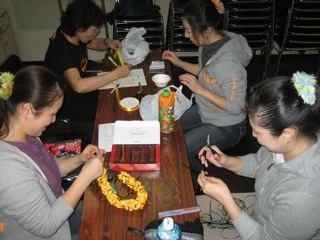 Hokuloaです。今朝 北見から札幌に移動して,クムのレッスンが行われました。今日はワークショップから始まり、大盛況の中 美しい曲にピッタリと合ったクムのフラに参加者の方々は感動していらっしゃいました。参加して下さった皆さま ありがとうございました。ほんの少しだけの休憩の後に行われたのが、ブランチレッスン。 私と同じクムリッチの弟子で、札幌を拠点として活動しているKさんのハーラウと一緒のレッスンです。クムのブランチレッスンではクムのスタイルを忠実に伝えているかをチェックして頂ける点と,その他にも日本人には苦手な顔の表情のレッスン等もあります。フラダンサーなら避けて通れない部分ですね。 クムが見本を見せて下さってから、皆さんが一緒にするのですが、目がかゆいの? と言いたくなりそうなウインクですでも.そのレッスン風景は照れくささから出るのか、笑顔満開のひとときでした。香りをかぐ様子は、なかなかいい感じです。 クムからの直接レッスンだと緊張もする様ですが、それ以上にとても楽しそうでした。 夜のブランチレッスンは私の時間設定の勘違いで、終わりがバタバタしてしまい、集合写真すら取れないで解散になってしまいました。ごめんなさい。昼のレッスン同様に、皆さんクムの指導に満足した2時間でした。お疲れさまでした! 明日はワークショップが2つ、そしてKさんと私は「クムクラス」と呼ばれる指導者対象のレッスンが昼にあります。明日は厳しい指摘を受ける事となりそうです(苦笑)。それがまた楽しみっ!