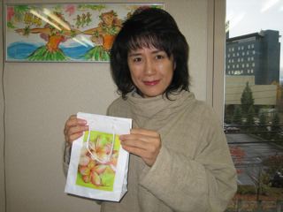 Hokuloaです。今日はKapuahaulaniさんが不在の為、札幌ハーラウのレッスンの詳細報告はひとまずお休み。休憩タイムの風景をご紹介します。と、その前に、10/24にめでたく50,000件のヒットを達成して、ヒット者の名乗りをお願いしていたところ、なんと 当ハーラウのMさんでした心ばかりのプレゼントの入った袋を手にパチリ 50,000ヒットを狙って見事にキリ番ゲットをしたそうです。ありがとうございました。それまでに見て下さった49,999件の皆様にも改めてお礼を申し上げます。さて、当ハーラウのレッスンは色々な事のてんこもりは言う迄もありませんが、休憩タイムのスウィーツも名物となっています。今日の昼間のレッスンのスウィーツは「笹だんご」。笹の葉の香りが良いとても美味しい草団子でした。函館からレッスンに来られているOさん、Mさんのお土産でした。皆がちゃんと食べれる様に沢山用意して下さってありがとうございました。さっさと食べてしまって、惜しくも写真を逃してしまいました。残念!夜のレッスンのスウィーツは、Nさんお手製の「クルミ入りバナナケーキ」。 バナナの香りと味、そしてクルミの歯触りがとても美味しかったです。 可愛らしいナプキンまで持参で皆お行儀よく頂きました。ご馳走さまです!レッスン終了後の疲れを癒してくれたケーキタイムでした。レッスンの合間、終了後にスウィーツタイムがあると、話も弾み、厳しい?レッスンの後だと心も体も和みます。毎回レッスンの度にあるスウィーツタイム。・・・決して食べてばかりいる訳ではないんですよ