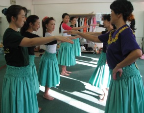 Kapuahaulaniです。今日も札幌は寒い一日でした。スタジオの廊下も冷え冷えとしてプルプルと震えが来る程でしたが、スタジオの中は、いつもの様に、熱気むんむん、私の眼鏡は勿論、鏡もすっかり曇ってしまう位、皆さん汗びっしょりの、フラレッスンが行われましたまずは初級クラスのベーシックからスタート今日は特にアミとカオのステップに重点を置き、体重移動の仕方を先生が見本を見せて下さり、皆真剣な面持ちで、正確なステップのお尻の動かし方を意識しながら練習しました。 先生の見本を食い入る様に見ながら!引き続き、ステップ練習を生かした基本のカヒコを2曲連続して踊り、細かいハンドモーションを先生にチェックして頂いて、手の高さなども各々しっかりと理解するように、意味と連動させながら練習しました。Hokuloa先生お得意の抜き打ち質問も、皆さんだんだん慣れてきて、しっかりと答えられていましたよチャンティングも慣れて来ました!最近の課題曲のアウアナは、何度か全員で練習した後、少人数のグループごとにダンサーと観客に分かれて、鏡を見ずに練習し、目線や表現力を身に付けるトレーニングをしました。皆さん、恥ずかしがらずに表現できましたか?アウアナは今日から新曲にも入りました。まずはいつもの様に、歌詞の意味と、歌のバックグラウンドの資料などを見せて頂きながら曲の雰囲気を理解した後、今日は1番の振り写しが行われました 資料を見せて頂きながらお勉強 その後に振り写しに入りましたグレイシャスクラスでも、まずはベーシックで汗を流し、引き続きカヒコを2曲連続して練習しました。 意識して角度を合わせながら! カヒコ練習歩きながらオリを唱える練習をした後は、最近のアウアナの課題曲を3曲連続して練習しました。ミドルテンポ・スローテンポ・アップテンポと全曲テンポが違うので、その曲に適した表情で踊る事を意識する様、先生からご指摘がありましたねこのクラスでも新曲練習が行われ、曲の意味とバックグラウンドの説明を聞いた後は、一気に全バースの振り写しが行われました誰もが知っているスタンダード曲で、可愛らしい振り付けの曲です。 写真資料に群がる皆さん 一気に全バースを踊りきりました!ワヒネクラスの前に、本日もカヒコ衣装のトップを一人一人のサイズに合わせて切り分ける作業が行われました。先週ご紹介した赤い生地に良く映える素敵な黄色の生地で、自分で作る事を思うとかなり憂鬱ではありますが、出来上がりがとても楽しみになって来ました。 ヒップ周りのサイズを確認して 各々のサイズに切り分けました。今日はHokuloa先生が見本のパウスカートを作って来て下さり、作り方の説明もして下さいました私はまず、今週中にスカートのスタンプ押しをしなくてはいけません。何とか時間を見つけて頑張りますワヒネクラスは年末でお忙しい方、最近の寒さで体調を崩してしまった方とお休みが多かったのですが、ベーシックではウエヘやダウンアミなど、フラ筋力を強化するステップの練習に重点を置き、パートナー同士で腰を掴んでしっかりと大きくお尻を動かす事を目標に頑張りました歩きながら、パフォーマンスを意識したオリ練習をした後は、基本のカヒコを3曲連続して休みなしで踊り、ここでもフラ筋力強化を意識して、正確なステップが踏める様に練習しました。今日はハワイから楽器類が届き、新メンバーもやっとマイウリウリを手にしたので、早速ウリウリの振り方から皆で練習し、徐々にステップを付けていって、カヒコの振り写しも行われましたアウアナも最近の課題曲3曲を連続して、2~3回ずつ踊り、身体の角度、手の角度や高さ、手の出し方、タイミングなど、全曲を先生にチェックして頂き、踊りの精度を上げていく為の練習が行われました。 先週習ったばかりのアウアナ先生のチェックを受けながらさすがにカヒコから何曲も踊り続け、かなり疲れていたので、最後に練習したアドバンスのカヒコでは、持病の膝がかなりまずい状態になっていましたが、取り敢えず、一回皆で揃える練習をし、本日も、無事に全レッスンが終了いたしました今週末はいよいよハーラウのクリスマスパーティが行われますフラタイムでは全クラス、今まで習った曲を全てご用意しておりますので、以前習った曲でも思い出しながら、沢山踊って下さいね!思い切り弾けて、楽しい夜に致しましょうSee you on Sunday! A hui hou!追記:器用な事ではワヒネクラス1~2のKちゃんが、わざわざパーティの景品用として、手作りのリボン携帯ストラップを寄付して下さいました(しかも5つもです)寄付金を出して下さったグレイシャスのTさんも勿論、お2人の暖かなお気持ちに感謝しつつ、参加する皆さんは、景品の争奪戦を繰り広げましょうね