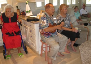 Kapuahaulaniです。昨日は仕事が一つキャンセルになったので、思い切ってカヒコのスタンプ押しを終わらせましたスタンプの数が限られているので、全員で順番にやっていかなくては間に合わない為、気持ち的に焦っていたので、相変わらず失敗もありましたが、何とか5メートルの生地にスタンプを押し終える事が出来、ほっとしましたただ昨夜から体調が悪くなり、早寝をしたのですが治らず、今日の昼間は寝たり起きたりしていましたが、夜に仕事が入っていたので、薬を飲んで出かけた所、やっと、少し調子が戻って来ましたご存知の通り、私の仕事は英語関係なのですが、日本には和製英語が氾濫しており、たまに私の生徒さん達も、英語だと思い込んで使ってしまう事も多々なので、その度に正しい使い方や本当の意味を教えています。その一つに「マンション」と言う言葉があります。私も日本で言う所の「マンション」に住んでいるのですが、英語圏で「マンションに住んでいる」と話すと、皆、びっくりしますし、普通は自分で自分の家をマンションと呼ぶ人もいませんなぜなら、英語でマンションとは「豪邸」と言う意味だからです。ディズニーランドにあるアトラクションの中に、「ホーンテッドマンション」と呼ばれるものがありますが、あの家はものすごく大きくて、立派な豪邸ですよね?あれはまさしく英語でマンションと呼ばれるに相応しい家なのです私は今回のハワイでそのマンションにご招待される幸運に恵まれました私がいつも宿泊するホテルのオーナー夫妻が、ご自宅にご招待して下さったのです。 ウクレレプレイヤーでもあるご主人とハワイアンブラッドの奥様(左の赤いムームーの方) お2人ともハワイアンミュージックとフラが大好きです。毎年ハワイでサンクスギビングホリディを過ごされている、カナダやメインランド出身の常連ホテルゲストの皆さんと共に、私もランチパーティに呼んで頂き、引っ越して間もないと言う、「マンション」の全お部屋を見せて頂きましたハワイアンオープンと言うメジャーゴルフトーナメントが行われるワイアラエゴルフコースに隣接し、カハラモールからもすぐ近くと言う、ハワイでも有数のリッチなエリアに位置するこのご自宅、バックヤードには勿論、大きなプールとジャグジーもありました プールの垣根の向こうはハワイアンオープンが行われるゴルフコースです!写真はキッチンと食堂のエリアなのですが、素晴らしい畳が敷き詰められた12畳位の日本間の他、大きなベッドルームが4つ、ダイニングルームも、リビングルームもすごく広い大豪邸です。事実、お家を探検している内に、迷子になりそうになった位です皆でアメリカンスタイルのホットドッグを主体としたランチを頂きながら、お喋りを楽しみ、食事の後はすぐにベースとウクレレでのハワイアンミュージックの演奏が始まり、当然の様に、フラのリクエストも皆さんから出たので、ご招待して頂いたお礼を兼ね、心をこめて何曲か踊らせて頂きました ランチを楽しんだ後は・・・ ハワイアンミュージック&フラタイムハワイの方々は、いつも人の事を思いやり、優しく接してくれます。私の様な、どこの馬の骨かも分からない人間の事も気遣って下さいますし、お世話を焼いてくれる方ばかりです。そういう方々に今まで何度も暖かなアロハを頂いている事も私がハワイフリークになった大きな要因の一つですねホテルのバンドの皆さんとの交流もそうですが、こうした方々と親しく交流するきっかけはいつも「フラ」でした。皆さん曰く、「気持ちの入った、心あるフラを踊る子に邪悪な人間はいない」と「だからあなたも良い子に違いないから、仲良くしたいのよ」と仰って下さり、今に至っていますそんなに「良い子」ではない私にとっては、かなり恥ずかしいお言葉ですが、とても嬉しいお言葉に、胸が熱くなりました。ハワイアンホスピタリティの真髄にどっぷりと浸って、甘えさせて頂いてばかりいる私ですが、皆さんの気持ちに応える為にも、心あるフラを踊り続ける努力をしなくてはいけないなぁ、と日頃の自分への反省を含め、フラの素晴らしさを改めて実感した一日となりました