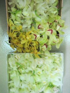 Hokuloaです。今日 頂いた蘭いろいろそれを見た瞬間に「これは使える」。そう、火曜日に札幌京王プラザであるパフォーマンスに「使える」ですまさに good timingそれで、すぐにチョッキンチョッキン 人数分たっぷりあります でも心配なのは、大荷物を持って更に花を入れたクーラボックスを持つ事は出来ないので、お花がピンとしたまま持つかどうか・・・。使うのも明後日ですしね。 JRから降りたら、後は外にたっぷりと雪があるし、廊下は寒いので、保存は冷蔵庫を使わなくても、レッスン中は心配なし。ホテルでは、バスタブに冷水と外の雪をプラスして、ビニール袋に入れた花をそこに入れれば、冷蔵庫に入れなくてもOKあ~、冬で良かった明日のレッスン時にワヒネ出演陣皆で作りますよっ