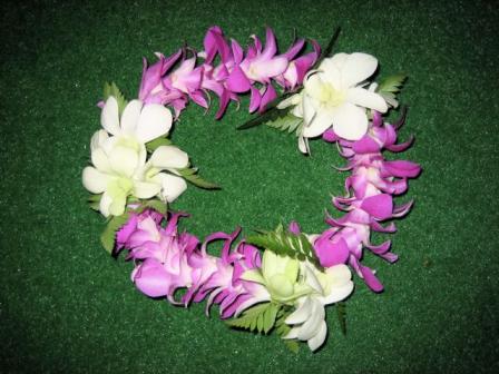 Hokuloaです。久しぶりにレイを作りました。 デンファレとレザーファーンのコンピ 試作品なので、材料少なめでかなり短めこれは、予定しているハーラウ内でのレイメイキングレッスンの為の試作。北見校では野外レッスン時に合わせて、札幌校では野外のイベントに出演する際の待ち時間を利用して、レイメイキングをする事となりました。生徒さんの中には、まだ生花でレイを作った事のない人もいて、「それではフラダンサーとは言えない!」とクムに怒られてしまいます。それは私がその機会を設けなかったからなのですが・・・初めての人には、簡単でなければダメだし、慣れている人がアッと言う間に作れるのも時間が余ってしまうしで、ま、この程度なら誰もが楽しんで作れるだろうと考えました。 糸で繋いだ「クイ」で、白のデンファレは4つがツイストしていて、その前後にレザーファーンを繋いでいます。これで3つのやり方は覚えるでしょ。生の花を扱うのを楽しんで作りたいですね。ハーラウの皆さん、お楽しみにね【北見校の生徒さんへ】 連絡事項を全員の携帯へ送信しています。メールをチェックして下さい