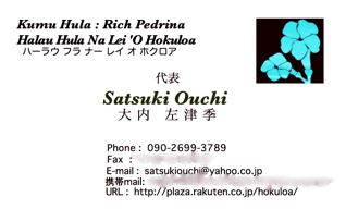 Hokuloaです。以前PCのハードディスクが破損して全てのデータを失ったのをお話ししましたが、その為に滞っていた様々な事を少しずつ少しずつクリアして着ました。で、ずっと困っていた名刺作り。もう手元には数枚しか残ってない名刺。使っていたソフトは家のどこかにあるはずなのに無いっ。仕方なく新たなバージョンも出たのを機に今回購入。今日やっと新しい名刺を作りました。 Web上で公表していない情報はボカしてあります 以前のものは、ハーラウフラワーのプアケニケニの写真を載せていましたが、今回はnew ハーラウTシャツのデザインをそのまま載せました。と言うか、それ以外は何も変えていないんですが・・・次回レッスン時には、生徒さんへもレッスンチケットもやっとお渡し出来ます。