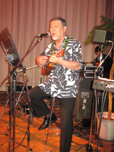 Haukeaです。毎年2月に行われるジミー石黒先生主催のフラパーティ「オリオリフラパーティ」。 沢山の曲を歌って下さったジミー石黒先生当ハーラウからの参加者は8人と少なめでしたが、会場の京王プラザホテルには、沢山のフラダンサーが集まり、盛大に行われました。 私たち8人で1テーブルだったので、リラックスムードで観覧しましたよ。 曲順が書かれた進行表とチケット進行表からもお分かりの通り、今回はCDでのフラが多かったですね。ウチはジミー石黒先生とカマアイナスの皆さんの生演奏で3曲踊らせて頂きました。 私のカメラだと顔がボケボケになっちゃいました この写真はM先生が撮って下さいました Mahalo様々な衣装を拝見して楽しませて頂きました。パーティの途中では、ハワイアンファクトリーさんの「大抽選会」。沢山・沢山のプレゼントが出されました。私たちのテーブルからも3人がゲット 3/8人で当たりましたよ くじ運のない当ハーラウにとっては、すごい確立ですハワイアンファクトリーでは、今年からウエディングドレスの製作・販売とレンタルを始めるそうです。そのPRに、ウエディングドレスのショーがありました。ナニレフアさんの可愛いワヒネ5人によるファションショー。5人もドレスもとっても素敵でしたよ 普段お会いする機会の少ない方々とお話し出来るのもまた楽しみの一つ。以前函館でお世話になったバンドのSさんがいらしていて、7年ぶりの再会が出来ました。パーティの終盤は、フリータイムでジミー先生が沢山の曲を歌って下さり、踊れるダンサーがステージに自由に上がり踊るのですが、残念ながら今回は当ハーラウが踊れる曲がなく、生徒さん達は見ているしかありませんでした。そんな中、ラストの曲で T 先生が客席を周りながら踊り、そのパフォーマンスに大喝采でした最後に多いに盛り上げた T 先生に脱帽ですまた来年もジミー先生がお元気で第9回目を開いて下さいます様にあ~、今日も楽しかったっ
