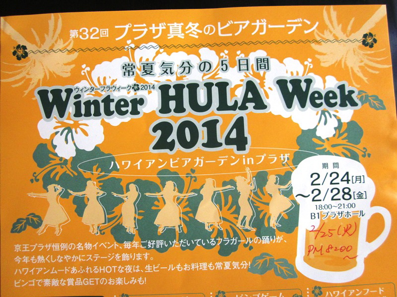 Aloha! Haukeaです。京王プラザホテル札幌の毎年2月の恒例イベントとなっている「プラザ真冬のビアガーデン」が今年も開催されますよ。 場所 = 京王プラザホテル札幌 地下1階プラザホール 開催期間 = 2/24(月)〜28日(金) 時間 = 18:00〜21:00フラステージ= 第一部 19:00(25分) 第二部 20:00(25分)ホクロアの出演は、25日(火)第二部です。第一部はナニレフアさん。ビアガーデンなので、飲食した分のお支払いのみです。お得なビール券(食事にも使えます)は1冊 ¥3,000(¥300 ×11枚綴り)がありますよ。第二部終了後は、色々と賞品が当たる抽選会やビンゴゲーム等もあり、最後の最後まで楽しめますよ当日行ったけど満席で入れない場合もありますので、席のご予約をすると確実に座れますよ。 画像をクリックすると拡大して見れますよご予約は ホテル直接 011−271−0111 営業企画一番寒い季節に真夏な雰囲気を是非お楽しみ下さい。皆さんの応援をお待ちしています