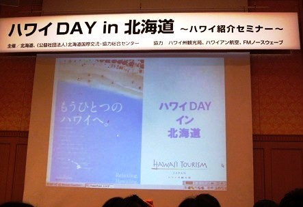 Kapuahaulaniです。もう2日前になってしまいましたが、とても暖かく過ごしやすかった1月30日の木曜日、札幌プリンスホテルパミール館にて開催された、ハワイDAY in 北海道と言うハワイ紹介セミナーに、私同様ハワイフリークのピヨピヨちゃんと2人で行って参りました 会場内FMノースウェーブ「アイランドブリーズ フロム ハワイ」のDJとして人気のペレ・レイコさんの司会進行により、北海道と北海道国際交流・協力総合センター主催で行われたこのイベント、北海道総合政策部の知事室長、窪田 毅氏のご挨拶から、始まり、すぐに丁度将来的に姉妹提携をしたいという事で、北海道を訪れていた、ハワイ州副知事の日系ハワイアン、Mr. Tsutsuiの素晴らしいスピーチ、彼の英語はまさに日系ハワイアンそのものの、とっても聞きやすい、私の大好きなタイプの英語で、日焼けした爽やかなTsutsui氏の笑顔から発せられるそのスピーチを聴くだけで、既にハワイ気分になったのは私だけでしょうか?日系人のTsutsui副知事司会進行のペレ・レイコさん本日の目的はハワイ旅行が初めての方は勿論、リピーターの方々にも、今一度ハワイの見どころや魅力を知って頂き、訪れて頂きたいというもの。特にオアフ島だけではなく、ネバーアイランドにも是非訪ねてほしいという事で、まずアイランドごとの魅力に関してハワイ州観光局のミツエ・ヴァーレイさんがお話して下さいました。今回のイベントの収穫はまさにこの方を知った事とにかくお話がお上手っそして知識も豊富っ今回は20分と言う短い時間だったので、結局オアフとマウイのお話で時間切れになってしまい、とっても残念でした彼女もまさにThat's Hawai'iって感じの爽やかで豪快な方で、話の内容はスーパーハワイフリークの私達にとっては周知のものばかりでしたが、それでもわくわくしながら楽しく聞かせてくれるスピーチの達人でしたハワイ在住日本人らしいでしょ?次のスピーカーはそれこそピヨピヨちゃんと私がファーストフライトにこだわって、弾丸ハワイツアーを行ったのも記憶に新しい、千歳空港より直行便を就航しているハワイアン航空さんの札幌営業所長、大村 ひとし氏でした。彼は独特の雰囲気でユーモアを交えてハワイアンエアの宣伝をなさってましたハワイアンエアの制服でお2人の講演の後は、地元3ハーラウによる、フラパフォーマンスもありましたやはり、ハワイと言えばフラは欠かせないものなのでしょうかね? 3ハーラウで30分間のフラパフォーマンスが行われました続いて講演者さんとペレさん、3名によるハワイに関するパネルディスカッションが行われ、またまた楽しいハワイのお話を聞く事が出来ましたトークショー最後は我々が今回の参加の前に、一番期待していた抽選会でしたハワイアン航空のハワイ往復航空券が当たるかもと期待に胸を膨らませていましたが、くじ運の悪い2人はやっぱり何もゲット出来ず、参加者全員に配られたハワイアン航空のシールだけで満足するしかありませんでした・・・(私たちにとってはこのシールもかなりのお宝で、嬉しかったんですけどね)お馴染みのロゴマークどんなイベントでもハワイと銘打たれたものは、何でも楽しめるんだと改めて自分たちのハワイ好きを確信した私とピヨピヨちゃんでしたそれと同じく、いやそれ以上のハワイフリーク、Tパパは会社から半休貰って参加していました・・・寒い冬の真っただ中、ますますハワイが恋しくなったイベントでした