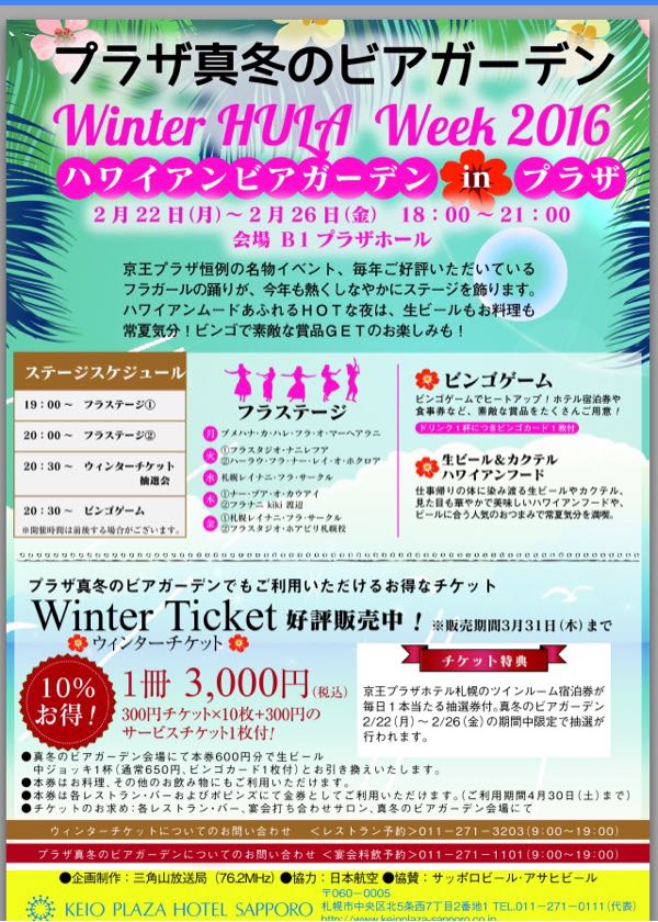 今年も恒例のイベントがやって来ます。 「プラザ真冬にビアガーデン」 京王プラザホテル 地下1階プラザホールで、 来週月曜〜金曜まて開催されます。 ホクロアは火曜日の第2部の出演です。 第1部はナニレフアさんですよ。 まだ行く曜日が決まっていない方は、 是非 23日(火) にいらして下さいね。 ビアガーデンは18:00〜21:00、 フラショーは、第1部 19:00〜、 第2部は20:00〜です。 寒〜い2月、暖かなホテル内でのビアガーデンとフラを堪能して下さいね。 料金は、お好みにご注文した飲食代のみで、 ショーチャージはかかりません。 お待ちしていま〜す(⌒▽⌒)/