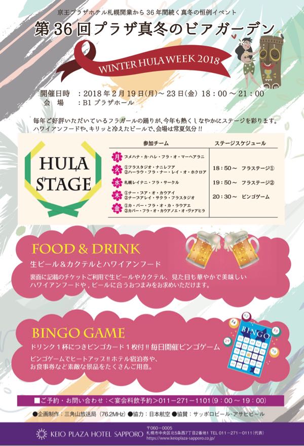 Aloha! 今年も恒例の「プラザ真冬のビアガーデン」が開催されます。 ホクロアは2月20日(火)に出演させて頂きます。 リーフレットでは第2部19:50からの出演になっていますが、 去年コラボして好評を得たので、 今年もナニレフアさんと一緒に1部&2部を踊ります。 是非 18:00からいらして料理とビールを楽しんで、 18:50からのフラショーを楽しんで下さいね。 今回初披露の曲もありますよぉ。 心よりお待ちしています!