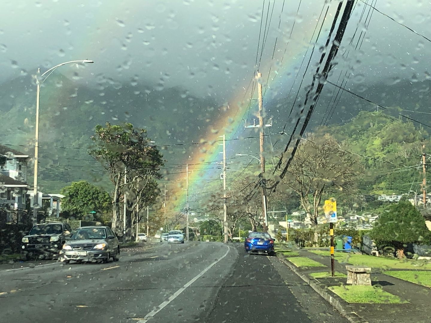 マノアは雨が多く、アーチの虹がよく見られるそうですよ。 マノアの雨の名前は「トゥワヒネ」。トゥワヒネが虹を出すのね。 高台から伸びた虹は大きなアーチで見れるのだそうです。 昨日マノアに行く時に、未だ見たことのない程の色鮮やかな虹が見れました。 地元の人も感激するほど。 虹の根元が見えてる! 写真の何倍も綺麗でしたよ。ダブルだしね。 こんなに近くで虹が見れるとは! 余りにも大きなアーチで全貌が撮れませんでした。 夜は月が出ていたので、マノアのナイトレインボーを期待したのですが残念! マノアの昨日の月。 今夜は澄みきったマノアの夜空。 昨日までは寒かったけど、今日は雨も降らず昼間はやや暖かさを感じたオアフでした。