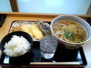 今日は会社の近くのうどん屋さんでお昼を食べました。うどんはかけうどん(大阪では素うどんと言いますが)にして、唐揚げ、エビ天、イカ天、ナスの天ぷらをトッピングをしました。おなか一杯になりました。