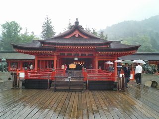 朝からホテルのバイキング形式の朝食でご飯2杯&パン2つも食べました♪2日目は雨でした・・・orzホテルを10時くらいにでて、目指すは宮島!いわずと知れた、日本三景の一つでございます(・∀・)近くのコンビニで傘とお酒を買い込みいざ出発!宮島に向かえば向かうほど雨が強くなってる気がする・・・(´Д⊂グスンそれでもなんとか宮島口に到着!ここからはフェリーで宮島へ渡るんですな。約10分ほど船に揺られてつきました!もちろん目指すは厳島神社っす。最初に見たイメージは・・・かっこいい! すっごい圧倒されますね! ちょっと小さくて見えにくいかもしれないっすけど、全体を撮影してみました(^^ゞそして大鳥居! 靴と靴下をビチャビチャのグチャグチャにしながら撮影した写真っす!(>_