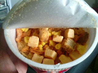 今日も暑かったっすよねぇ~(´ρ`)今日、日中だけで500mlのペットボトル6本くらい消化しました(^^ゞあとカキ氷も1つ。。。お腹が下らないか心配だったけど、今のところ平気みたい♪今日のお昼は食欲があまりなかったから、カップヌードル1個・・・でもただのカップヌードルではございやせん!自分で具を選んで作成した、オリジナルカップヌードルでございやす!!具はこんな感じっす。 タマゴ・キムチ・チーズ・チキンカツ 味はシーフードチキンカツは珍しいかったんで、とりあえず入れました(^^ゞ製作段階では、チーズ×4っていう案も出たんだけど、それだと狙いすぎだと思いやめました笑お湯を入れて3分まったらこんな感じになりました。 シーフードとチーズはイイ!!( ゚Д゚)ウマーコクが増すんですよ!σ゚д゚)ボーノ!キムチのシャクシャク感もなかなかでした♪タマゴは定番だけど、必要不可欠だし♪ただ、チキンカツはいらなかったかも。。。(´・ω・`)やっぱりエビにしとけばよかった~~~!(>_