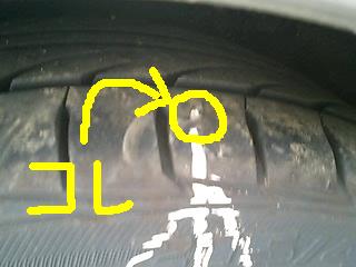 今日は朝からツイてなかったですよ(´ρ`)車でいつもどおり資材置場に行って、ラジオ体操とミーティングをやりました。それが終わって、車で近くにある事務所に向かったんです。そのときから『カチッ・・・カチッ・・・』って変な音はしてたんですね。「タイヤに小石でも挟まったかな?」なんて思って、車降りてみたら・・・ぶっとい針金がタイヤにぶっ刺さってました orz引き抜こうとすると『シュー』って空気抜けちゃうくらい見事に刺さってました(;・∀・)これはいかんと思い、とりあえず根元でぶった切りましたよ↓ ※見えます?走れる状態だったんで、ディーラーが開店する時間まで待って向かいました。そしたらパンクの修理で大丈夫なんですって。なんかゴムみたいのを突っ込んで塞ぐだけみたいッス(´・ω・`)30分くらいであっけなく処置が終わりました。なんだかあれだけ焦った自分が、ちょっと恥ずかしかったですヽ(´Д`;)ノアゥア...