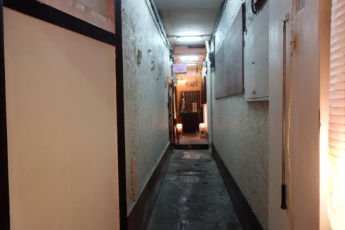 横浜市有数の歓楽街の一つである男の天国の福富町。輝くネオンの下には無造作に止められている車に、外国人の客引きが数多くいるディープエリア。立ち並ぶビルには無数の外国人スナックが入っており、日本人率の低い地域。そんな福富町と長者町との境にディープでありながら、歴史あるビルが建っているのです!福富町の境目となる、長者町8丁目に建っている「エイトセンタービル」。地下1F、地上5Fのこのビルは、昭和39年に建てられ、野毛に出ていた屋台を一同に集めた歴史のあるビルとのこと!(クリックで拡大)ビルの入り口には、「夜のコーナー 気軽な酒の31店」との看板。現在、営業しているのは15店舗ぐらいでしょうか?「気軽な酒」と書いてありますが、一見さんがちょっと一杯!なんて気軽に入って来れる雰囲気では無いですけど!さっそく怪しいビルに潜入してみましょう!ビル内に入ると、さっそく怪しいスナック名が書いてある看板発見!現在はB1Fと地上3Fの4フロアだけで営業中!この地下には行ったことがないので、少しだけ覗いて見ましょうね!多少のジメジメ感がある地下街は、営業しているお店はほとんど無いようです!写真を撮っていたら、このビルの管理人さんが出てきて、「なにやってんの」って、怒られちゃった!さて、今回目的のお店は怪しいビルの2Fにある、先日、アド街の伊勢佐木町特集で紹介されたお店「ステーキ 弱肉強食」。テレビで放映されたので、反響が大きいのかと思い、ネットで調べてみるものの、やはりこのビルに潜入できるフードファイターは少ないかな?ほとんど情報が出てない・・・ということで、私が調査しますわ!さっそく潜入開始!ちなみにその正面のお店の「たらふくちゃん 番外編」には、良く行きますよ!店内はカウンター席のみで6人で満席になるような小さなお店。狭い厨房には所狭しと厨房機器が並んでいて、良くここでステーキ屋をやる気になったな!というほど色々な物が置いてある!まずは「ハウスワイン赤(480円)」最初は私一人でしたが、しばらくすると常連さんが一人来て、マスターと世間話をしていましたね。頼んだのはオーストラリア産のリブロースを使った「ロースステーキ200g(1380円)」熱々の鉄板の上にはコーンに茹でたジャガイモと、バターが乗っていて網目で焼かれているステーキ!この日はなんとなく小腹が空いていたため、「半ライス(100円)」も注文しちゃいましょう!となれば、良心的な価格で提供されていた「なめこの味噌汁(150円)」も一緒に頂いちゃいますよ!ミディアムレアで焼かれたお肉は、脂身が少なくて、スジも多少はあるけど気にならない!ただ、ちょっとパサパサ感があって、価格相応かなというレベル!ステーキというと、ここから200mほど離れている、これまたディープな親不孝通りにあるステーキハウス「ハワイ」には良く行くのですが、そこの同じ価格帯であるハワイステーキに比べる、個人的にはとジューシーさが足りないと感じました!まあ、どちらが好きかは、両方のお店に行ってみて、気に入った方に行けば良いかと思います! 弱肉強食 (ステーキ / 日ノ出町駅、伊勢佐木長者町駅、関内駅)夜総合点★★★☆☆ 3.2