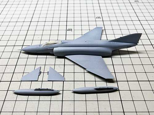 LS F-4を ファントム無頼680号機にする その2 です。今回から塗装の開始です。今回のキットは成形色がダークグレーなので塗装色を考慮しサフを吹いてから塗装する事に。次に機体の塗装です。680号機の特徴と言えるエアインテイク前のスプリッターベーンと尾翼のラダーに描かれている 赤いギザギザ(確か新選組のだったかな) ですが、今回は塗装しようと思います。昔 ハセガワ から1/72のファントム無頼680号のキットが発売されていたようで、そのデカールをネットでGET。それをサイズやたわみを調整してマスク用のラベルを制作。(ギザギザ部を切り取った透明部を使用)まずはスプリッターベーンとラダー部にホワイトを塗装しマスク用ラベルを貼り付けレッドを塗装という手順でギザギザ部を塗装しました。使用したのは ガイア ピュアホワイト と クレオス 68モンザレッド です。エアブラシを シュシュ って感じで塗装。しかし・・・なんかラベルを上手く貼れずに赤部分が多くなってしまった(特にスプリッターベーン)失敗です!塗装した部分をリムーバーを浸み込ませた綿棒で拭き取り、モールドに残った塗料を溶剤を付けた筆で洗い流しました。当該部分と周りを軽くヤスって サフ ホワイト レッド の順に再塗装。今度は上手く行った感じです。続いて機体の塗装。今までは上面を塗装してから下面を塗装してましたが、今回はセオリー通り明るい色の下面から塗装。使用したのは クレオス 316ホワイト です。下面をマスキング後に上面を塗装。使用したのは クレオス 315グレー です。タンクの下部は 311グレー で塗装。今回は以上です。
