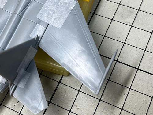 そして翼端のミサイルラックですが。実機の写真を見ると前側が段落ちしているのが有ります。