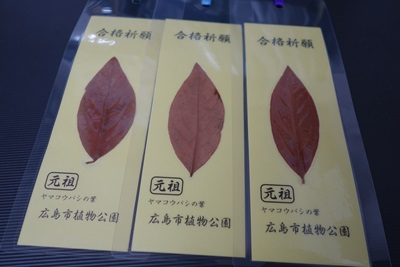 こんにちは。広島市内の観光地や、宮島の観光情報、広島県内の観光地をご紹介しておりますパークサイドホテル広島平和公園前の若旦那です。2月6日の広島は朝からずっと雪が降り続いております。こんなことは滅多にないので思わず空を見上げながら歩いてしまいますね。しんしんと降り続けるこの雪は明日まで続くようです。今晩が一番冷え込みそうですね~。さきほど外出先から帰って来たのですが、指がかじかんでしまってきちんとタイプができないです、、、、ううう。さて、昨日は広島市植物公園まで車ででかけてきました。その目的は、、、こちら!ヤマコウバシの元祖おちない葉っぱしおりを購入するためです。4年くらい前から受験生の方にプレゼントを初めたのですが、年々受験生の方のご利用が増えておりまして、今年は一気に100枚も購入させていただきました。広島市植物公園の方も、、、え?100枚もですか?といった反応をされておりまして、「塾の先生でいらっしゃるんですか?」と聞かれちゃったほどです。受験生の方にプレゼントしているんですよ~とお伝えすると納得されておられました。この合格祈願「落ちない葉っぱ」しおりに使われているヤマコウバシという葉は、「クスノキ科クロモジ属の低木です。葉が枯れても、冬の間、枝に付いたままで落ちません。枯れ葉は春に花が咲き、新芽が出た後に入れ替わります。「山香ばし」の名は、枝や葉によい香りがあることに由来します。」そうなんです、落ちないんですよね!なので合格祈願のお守りとして販売されているそうです。なるほど!私が受験生のときにこのしおりがあれば、、、、合格してたかな、、、とにもかくにも受験シーズンに一番大切なのは、体調管理ですからインフルエンザや風邪に気をつけてラストスパートがんばってくださいね!陰ながら元受験生代表として応援します!合格祈願「落ちない葉っぱ」http://www.hiroshima-bot.jp/osirase/kouen_news/topics/yamakoubashi/goukakukigan_yamakoubasi2013.htm