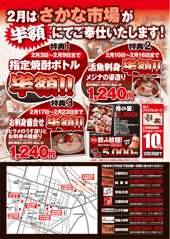 こんにちは。広島市内の観光地や、宮島の観光情報、広島県内の観光地をご紹介しておりますパークサイドホテル広島平和公園前の若旦那です。まだまだシンシンと雪が降り続いております広島です。17時でシフトが交代するのですが、みんなこの雪の中帰宅するのを嫌がっていました。それくらいの寒さになっております。明日の晩までひょっとしたら降るかもしれないとのことでした。広島にお入りになられる際はいつもよりも厚着をされることをおすすめいたします。さて、2月からこんなイベントがパークサイドホテル広島平和公園前1Fのテナントさん、さかな市場さんで始まっていました。2月9日までは焼酎ボトルが半額になっています!そして来週からはお刺身が半額に!この機会にぜひご利用くださいませ。パークサイドホテル広島にご宿泊のお客様以外でもご利用いただけますよ~!ご宿泊のお客様はルームキーをみせていただくとドリンク1杯無料サービスです!