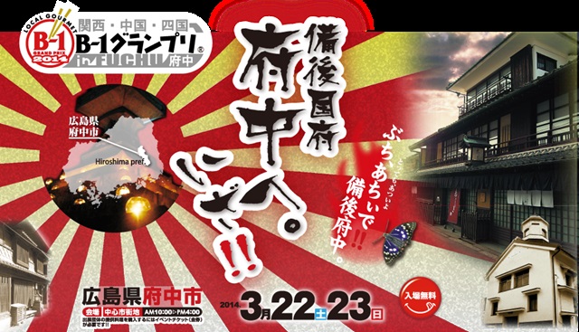 こんにちは。広島市内の観光地や、宮島の観光情報、広島県内の観光地をご紹介しておりますパークサイドホテル広島平和公園前の若旦那です。なんだか夕方になって急激に冷え込んできた広島です。どうしちゃったんでしょうかね。今日は最高気温が10度と聞いていたのですが、なんだか10度までいっていないような気がしちゃってます。この週末の大雪はほんと大変だったようで、東京からのお客様は皆様口々に大変だったとおっしゃっておられました。来週末、、、実は東京に行くのですが、、、同じようなことになると、、、そんな心配よりは明日の結婚式のスピーチの心配をしなければ、、、、直前になるまで考えようとしない悪い癖が、、、さて、気持ちを切り替えて広島の情報のご紹介です。私はテレビでしかみたことがないのですが、みなさまもよくご存知のB-1グランプリの関西・中国・四国大会が来月、ついに広島で開催されるんですよ!広島と言っても広島市内ではなく府中焼の地元広島県は府中市で開催されるんです!その名も、2014 関西・中国・四国B-1グランプリin 府中 !実はこっそり楽しみにしていたんですよね~。おそらく広島の人たちはB-1グランプリに行かれたことがない方が多いと思いますので、かなり注目を集めていると思います。もちろん隣県の方々も!いや~どんなおいしい食べ物が集まってくるのかいまからわくわくしておりますが、行列をしてでも食べに行って見たいと思っております。ぜひ広島にご旅行を考えていらっしゃるお客様は広島県は府中市に行かれてみてくださいね!2014 関西・中国・四国B-1グランプリin 府中 開催日 平成26年 3月22日(土)・23日(日)開催時間10:00~16:00会 場 広島県 府中市中心市街地http://www.b1fuchu.com/index.html