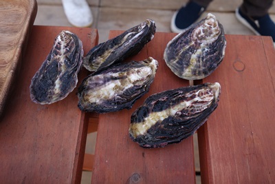 こんにちは。広島市内の観光地や、宮島の観光情報、広島県内の観光地をご紹介しておりますパークサイドホテル広島平和公園前の若旦那です。2月22日の広島は朝からとっても天気がよかったです。昨日東京に出張にいっておりまして、今朝朝一番の飛行機で戻ってきました。朝日が心地よかったです。渋谷駅でJR山手線の5時25分の列車に乗ったのですが、めちゃめちゃ混んでいてびっくりしちゃいました。東京ってすごいな~!さて、先日からご紹介しております大崎上島のファームスズキさんのご紹介の続きです。おいしい牡蠣と車海老をいただいて、大満足しながらさて帰ろうかなと思っていると、「コーヒー入れますのでいかがですか?」とスズキさんからご好意をいただいちゃいました。寒かったのでありがたいですと甘えちゃいました。コーヒーが入るのを待っていると、スズキさんがおもむろに牡蠣を探し始めて、、、「これはいい牡蠣に仕上がっているね~。」とスタッフの方とお話されていました。確かにおいしかったもんな~と思っていると、スズキさんから「これ、どうぞぜひ食べてみてください。」とこちらの牡蠣をだしてくださいました。あれれ?ファーマーズプレートやジャンボ塩田熟成牡蠣、若姫とは違う牡蠣のような、、、、「そうなんです。これは広島の原生種といわれている牡蠣なんです。この縦縞が特徴なんですよ。一度はいなくなったようなのですが、復活させてみました。塩田から一度も外洋にだしていなくて、産卵もさせていないので安心で一番美味しい状態ですよ~!ぜひ食べてみてください。」ということでいただいてみました。牡蠣をあけてもらうと、なんとエメラルドグリーンのような美しい色合いです。こんな色の牡蠣はみたことがありません。いただいてみると、おいしい~!味が濃い!大きさは小さいですが味はしっかりしていますね。その名も広島ストライプオイスターと名づけられたそうです。3月末まで注文が可能ですので、ぜひ一度注文されてみてくださいね。すばらしくおいしいですから~!ファームスズキhttp://shop.farmsuzuki.jp/