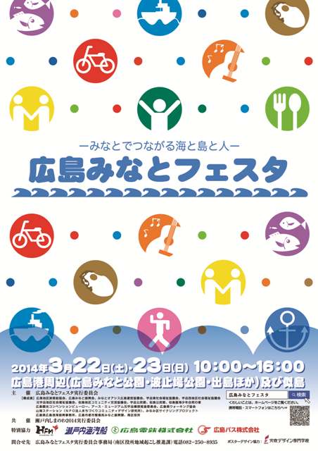 こんにちは。広島市内の観光地や、宮島の観光情報、広島県内の観光地をご紹介しておりますパークサイドホテル広島平和公園前の若旦那です。2月も残すところ明日28日のみとなりましたね。ついこの前までお正月だと思っていたのに、、、そうそう今月は同級生がいきなり2組も結婚するって報告をうけたびっくりした月になりました。これからお祝い事が続きそうですね~。さて、来月3月に広島ではいろいろなイベントが開催されますが大きなイベントといえば、瀬戸内しまのわ2014ではないでしょうか?そのイベントにあわせて、こんなイベントが開催されます。その名も広島みなとフェスタ!今年で2回目になるようです。一言で広島みなとフェスタといっても、詳しく広島市のホームページをみてみるとさまざまなイベントが開催されるようですよ~!コスプレ大会なんかも開催されるようです!またミシュラン広島に掲載されたお店のテントで、1日見習い(調理サポート体験者)を募集しているそうです。みなとフェスタからこんなイベントが考え出されるなんて!かなり柔軟性ある発想でおもしろそうですね。瀬戸内しまのわ2014のイベントとあわせてぜひお楽しみください!広島みなとフェスタhttp://goo.gl/5PvNEM