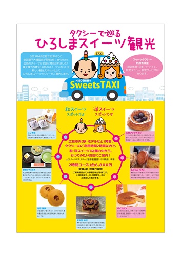 こんにちは。広島市内の観光地や、宮島の観光情報、広島県内の観光地をご紹介しておりますパークサイドホテル広島平和公園前の若旦那です。2月28日、なんだかさみしくもありますが明日からいよいよ3月がスタートします。3月といえば、春休みですね~。すでにパークサイドホテル広島にも卒業旅行などの団体様のご予約を多数頂戴いたしております。私の卒業旅行は、、、どこに行ったかな?私は一度しか卒業旅行に行ったことがないのですが、その思いでは、、、重いです。さて、昨日自宅に戻ってニュースを見ながら夕食をとっているとこんなのが紹介されていました。その名も広島スイーツタクシー!スイーツタクシー?なんですか?なんとタクシーにのって広島の有名なスイーツ屋さんをめぐって、体験したり限定スイーツを食べたりとスイーツ三昧が楽しめるんだそうですよ!昨年は広島菓子博覧会が開催され、80万人以上のお客様が来場され成功裏におわりましたのでそのいい流れを継続させていきたいということもあるようです。広島といえば、牡蠣、お好み焼などがメインになっていますが実はスイーツもすごいんだぞ~!というアピールが全国からお越しになられるお客様にできたらいいですね~!スイーツスポットは生粋の広島人の私から見てもなかなかのチョイスになっていますよ~!スイーツタクシーって珍しいのかなとおもったら全国で3番目なんだそうです!すでにやっているところがあったんですね!すごい!スイーツ大好き女子はもちろんですが、男性の方にもぜひ利用していただきたいですね。4名様までの利用で1台が6800円だそうですよ。4名で利用したらかなりお得ですね!私も一度利用してみたいと思います!広島スイーツタクシーhttp://www.taxikyokai-hiroshimaken.jp/