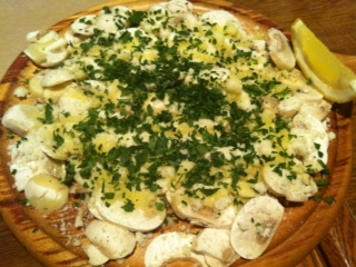 まず登場したのは、マッシュルームとチーズのサラダ!なんと生のマッシュルームです!MIRAさんがみたら、とっても驚くでしょうが、一口いただくと、、、、これがおいしい!マッシュルームのいい香りと食感がたまりませんね。チーズと相性が抜群です!