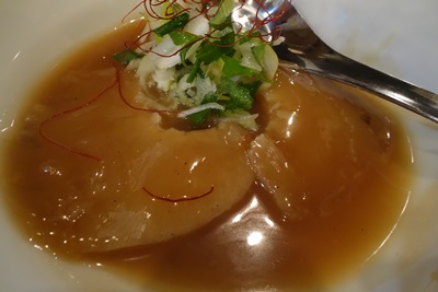 と、楽しく時間が過ぎていっているとおもいきや、、、あれ?なんですか、、これは、、、、メニューをみてみると、、、フカヒレ姿煮という文字が、、、すぐ注文!餃子が280円というリーズナブルな龍さんにしてはいい値段ですが、フカヒレこの値段では普通食べれませんよね?